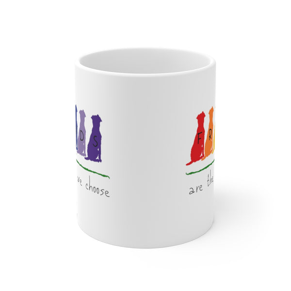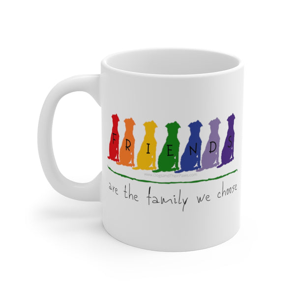 Friends are the family you choose. This white ceramic mug has a rainbow of 4 foot friends and family members. It is perfect for coffee, tea and hot chocolate. This classic shape white, durable ceramic mug in the most popular size. High quality sublimation printing makes it an appreciated gift to every true hot beverage lover.